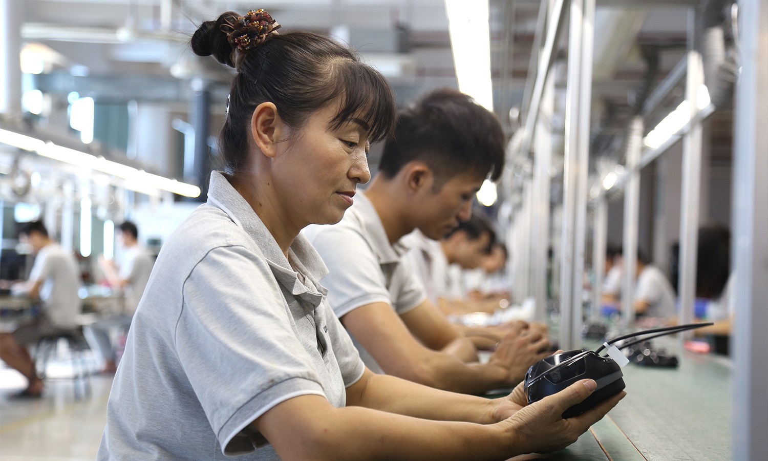 现有组装流水线2条现代化的生产线(可随时扩成4条),对太阳能控制器,逆变器,储能、工业降噪耳机、等工业产品组装经验丰富 ;能够生产绝大部分的数码电子产品,极强的综合生产能力,日产能达到1万PCS以上。防静电PVC空调车间,配备有老化房,测试房,成品测试隔音隔离房等,设备先进、完善,可进行各种产品镭雕、组装、老化、测试、包装等生产。